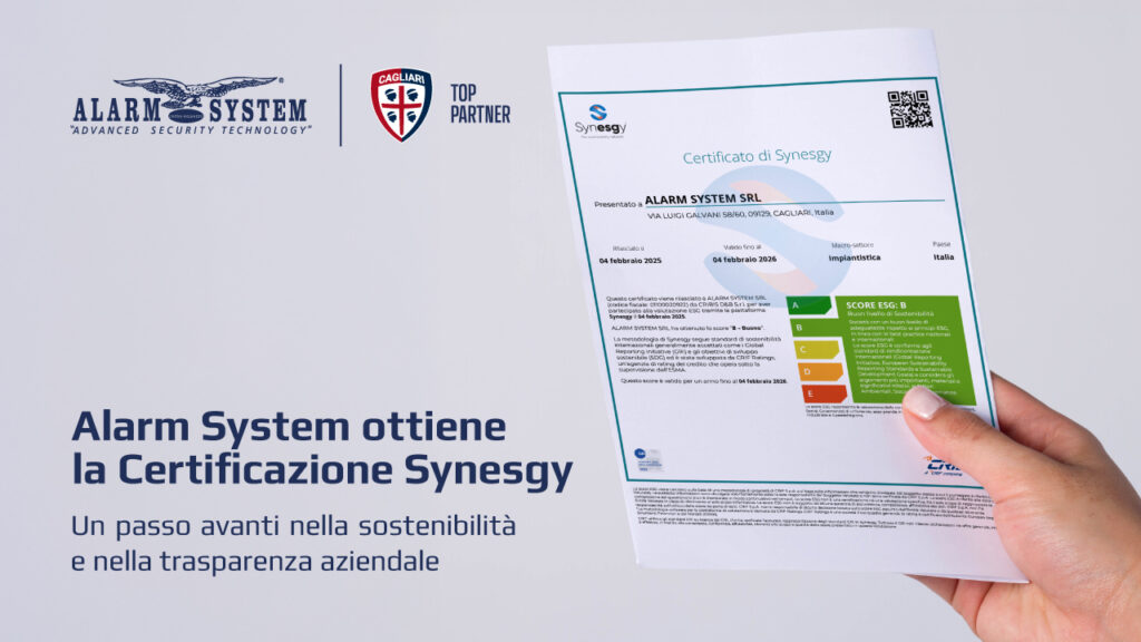 Siamo orgogliosi di annunciare che Alarm System ha ottenuto la certificazione Synesgy, un importante riconoscimento che attesta il nostro impegno verso la sostenibilità, la responsabilità sociale e la trasparenza aziendale.